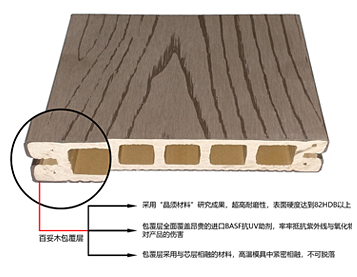 成分:一代塑木(芯層)+ 塑料(包覆層保護) 分類:因外層塑料包覆程度而分為半包覆和全包覆