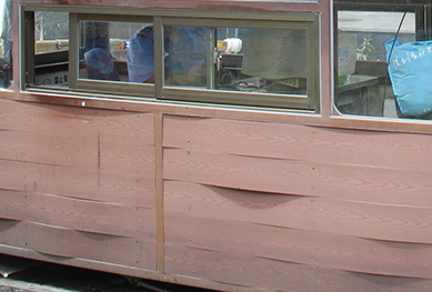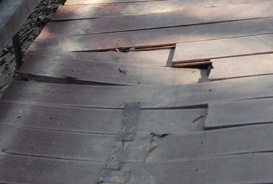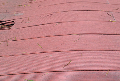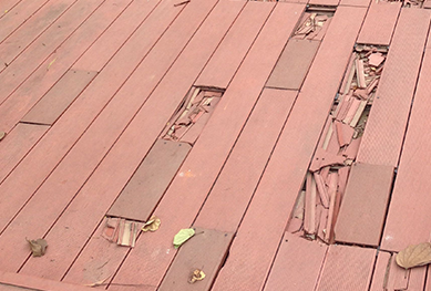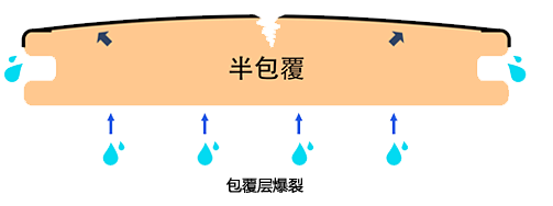 包覆層是吸水率極低的塑料,而芯層依舊是一代塑木,木粉比例高,且木粉與塑料不充分融合,導致木粉長期暴露在戶外環境和水份中,吸水膨脹。在日照強烈的地區且雨水量多的地區,當水份持續地從底部和卡槽部分吸入,下層板材吸水膨脹,同時板材卡槽位置被固定在骨架上,受力不均勻,導致板材向兩端翹起變形嚴重,嚴重的甚至會把卡槽位置拉致爆裂。