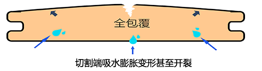 吸水導致板材內部膨脹,而包覆層與芯層吸水率和收縮率不一致,積累到一定程度,就會使包覆層爆裂。