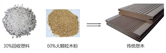 30%左右回收塑料+60%顆粒較大的木粉甚至是木屑,添加一定助劑混合而成。