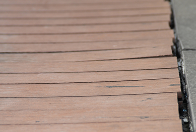 部分共擠塑木添加了上半部分的保護層,可以阻擋上方的紫外線UV,在一定時間內可降低褪色的程度。但是,包覆層和芯層是由不同的材料組成,而他們的熱脹冷縮率和吸水率不相同,所以產生了新的問題。