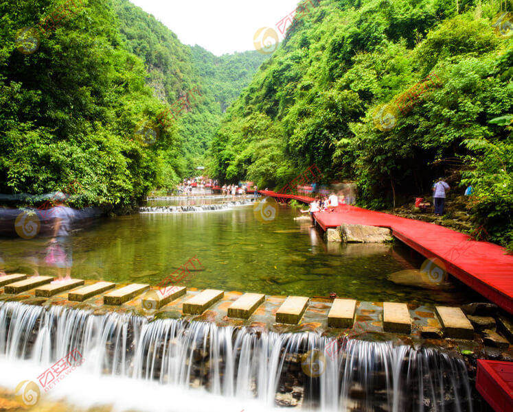 紅色塑木棧道,鑲嵌在景區中的一條長龍