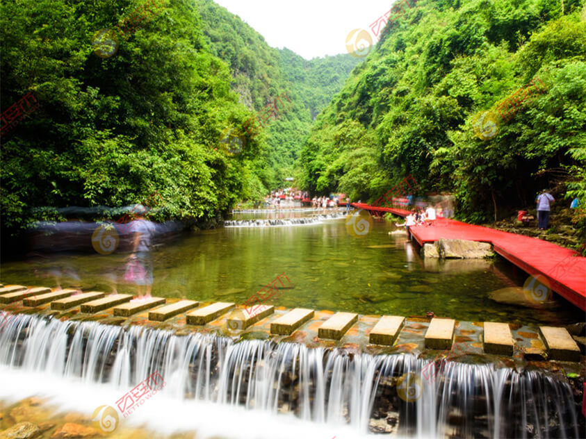 馬山縣古零鎮樂平村水錦屯,有一處長達10多公里的大峽谷,峽谷途經之地,山泉匯集成河,經峽谷流出。峽谷地形成低至高狀,道路艱險,峽谷內氣候宜人,河流經過的地方有瀑布、有水上滑滑梯和階梯泳池等天然美景,令人神往。項目采用的是百妥木色卡上的06號色,色澤光亮,無需油漆處理