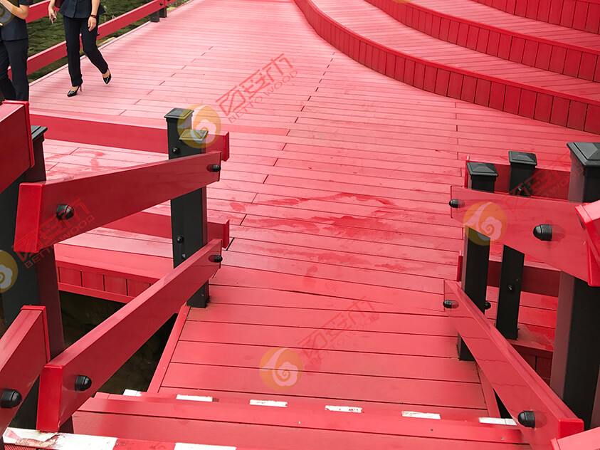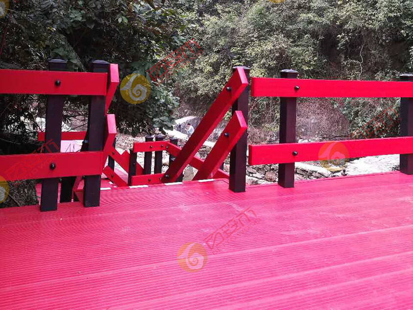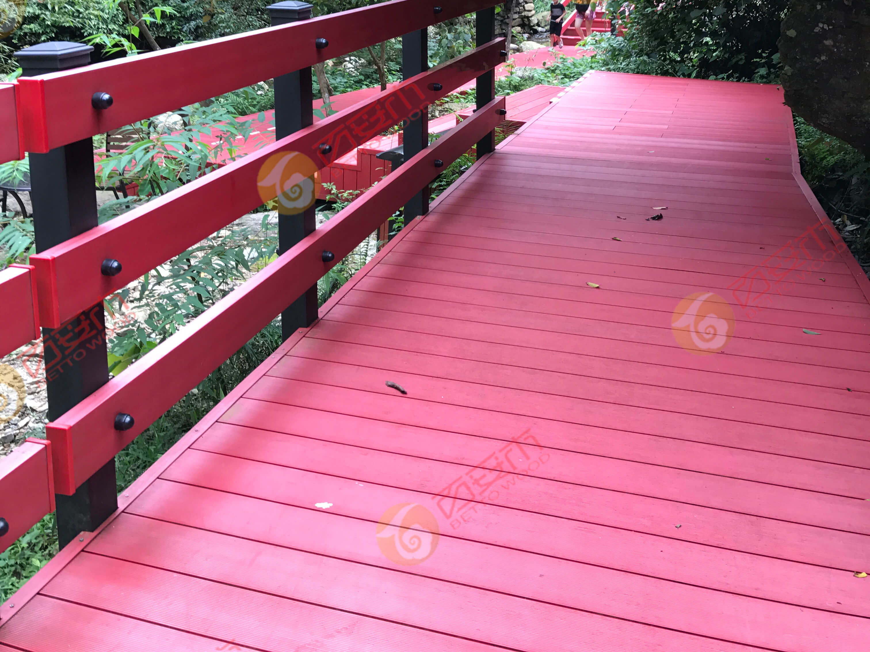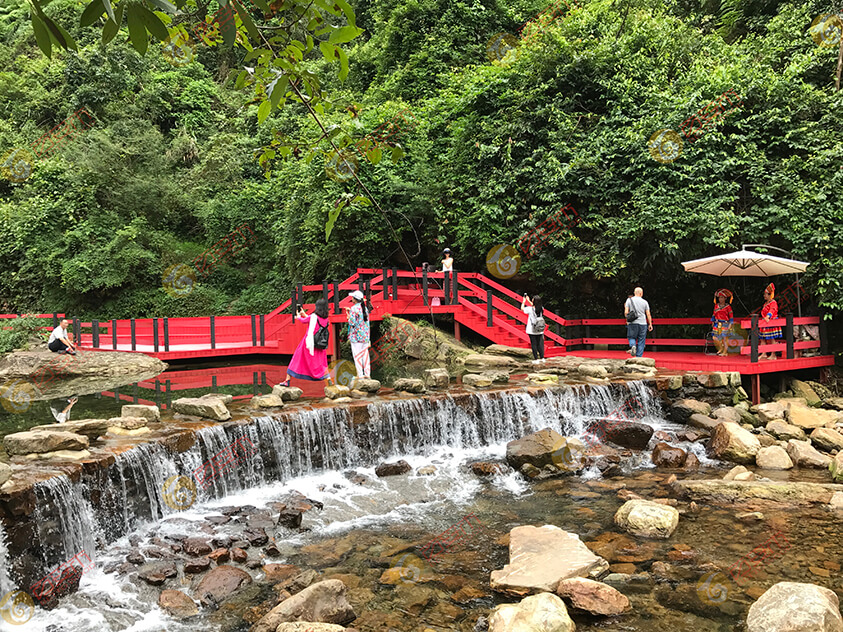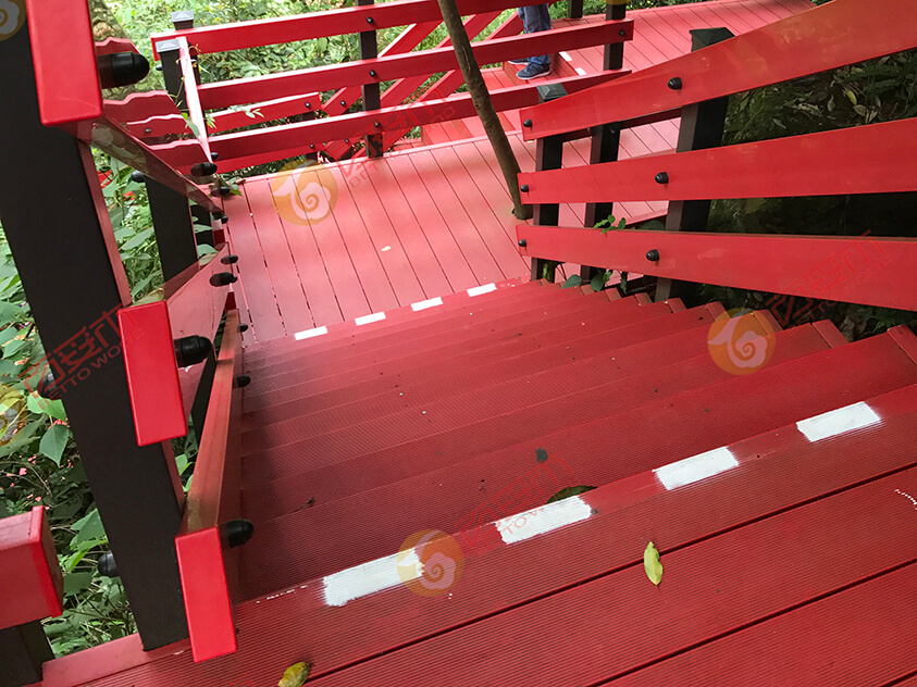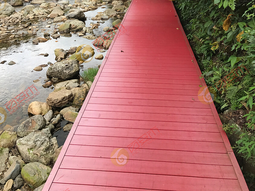 紅色塑木棧道,鑲嵌在景區中的一條長龍